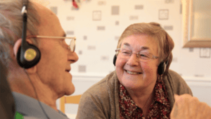 https://vimeo.com/78719951 Harry and Margaret were the first couple Playlist for Life worked with. Harry had severe dementia and lived in a care home. Margaret, his wife, came every day to see him and left most days in tears. Harry had stopped responding to her. See what happened when they started listening to his playlist together.